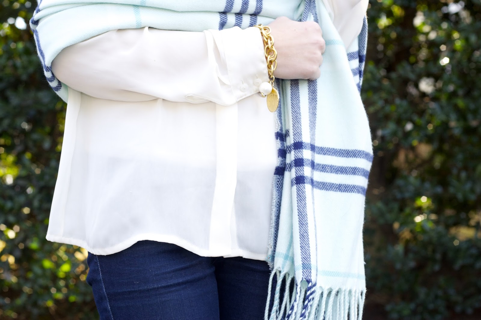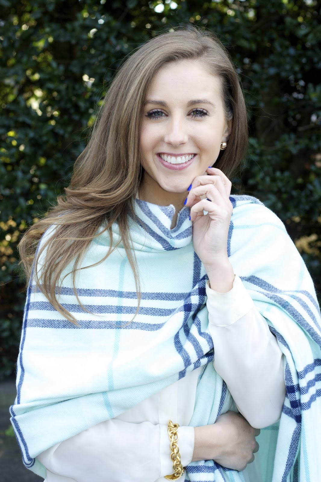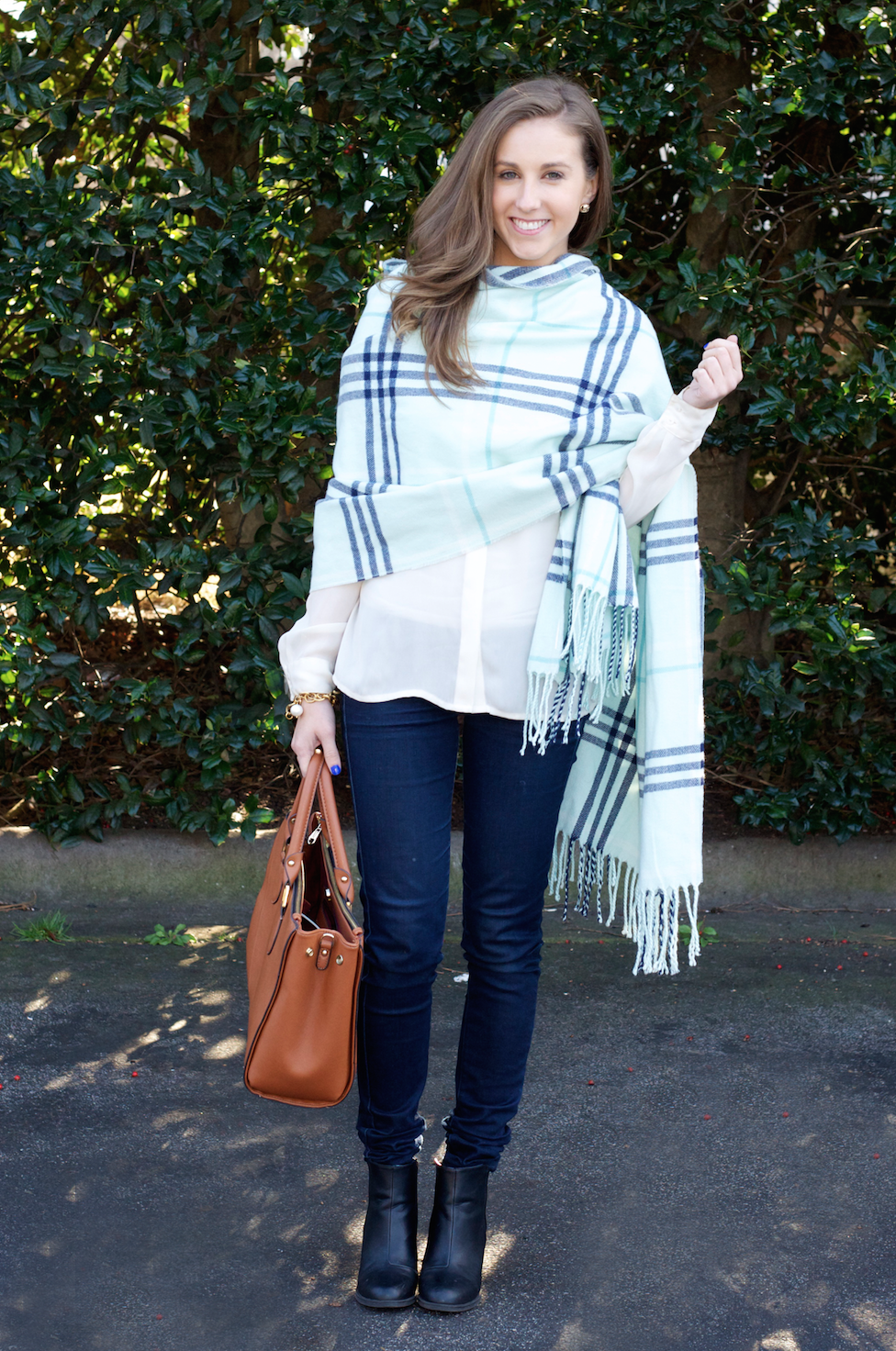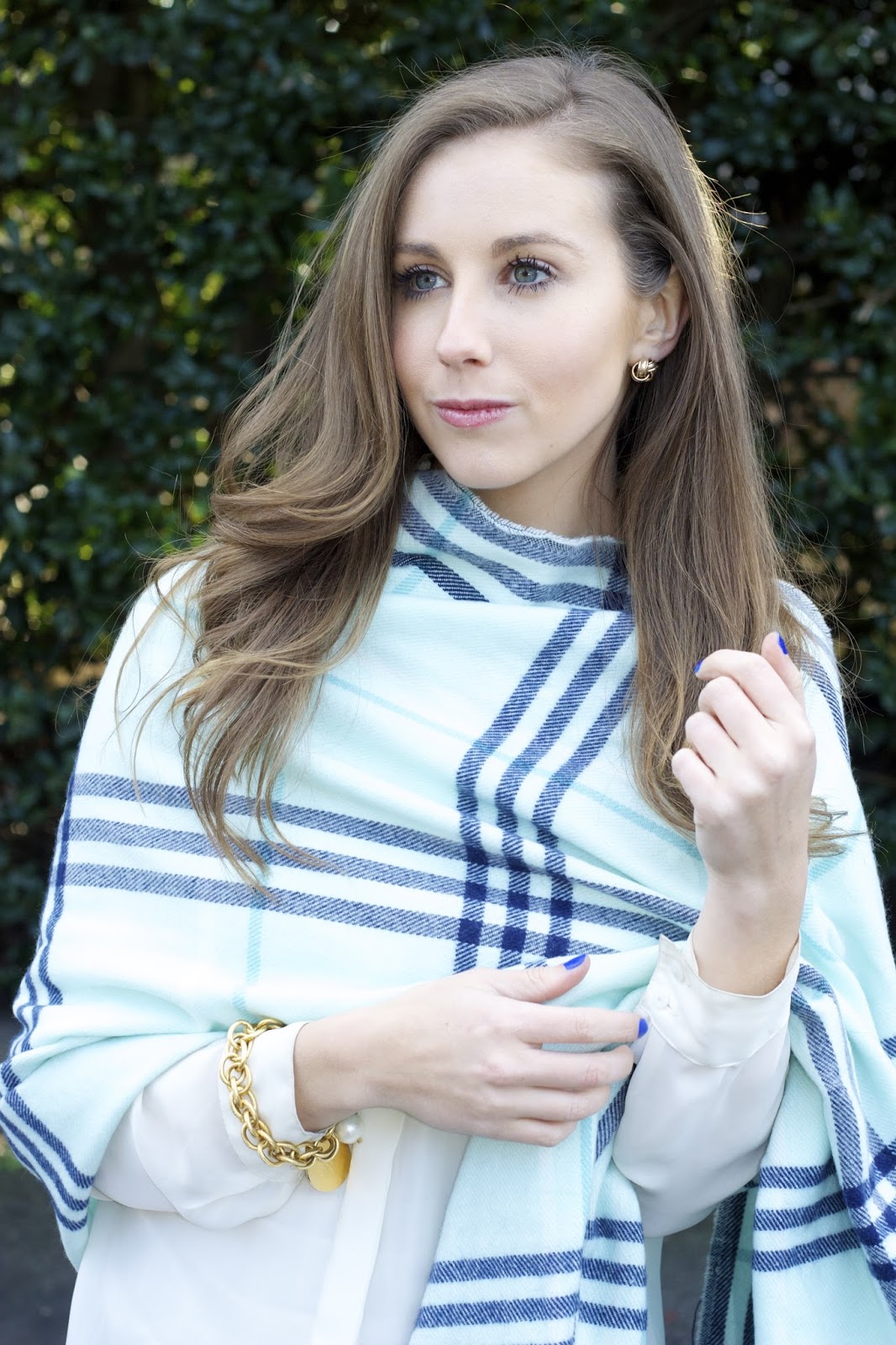 I love when blaket scarves are styled differently. This is perfect! And that color looks amazing with your eyes. xo
