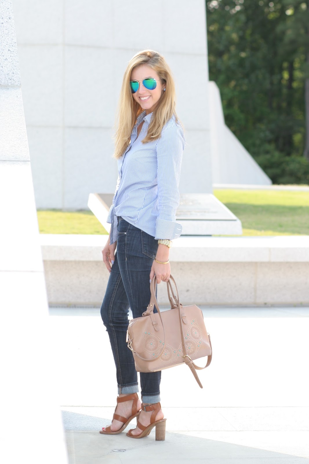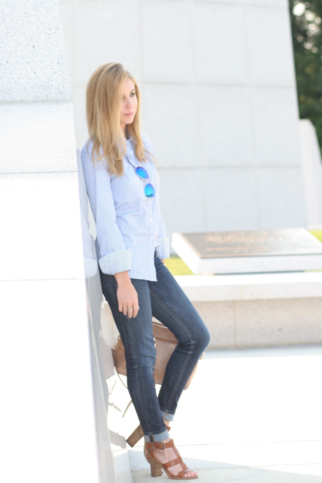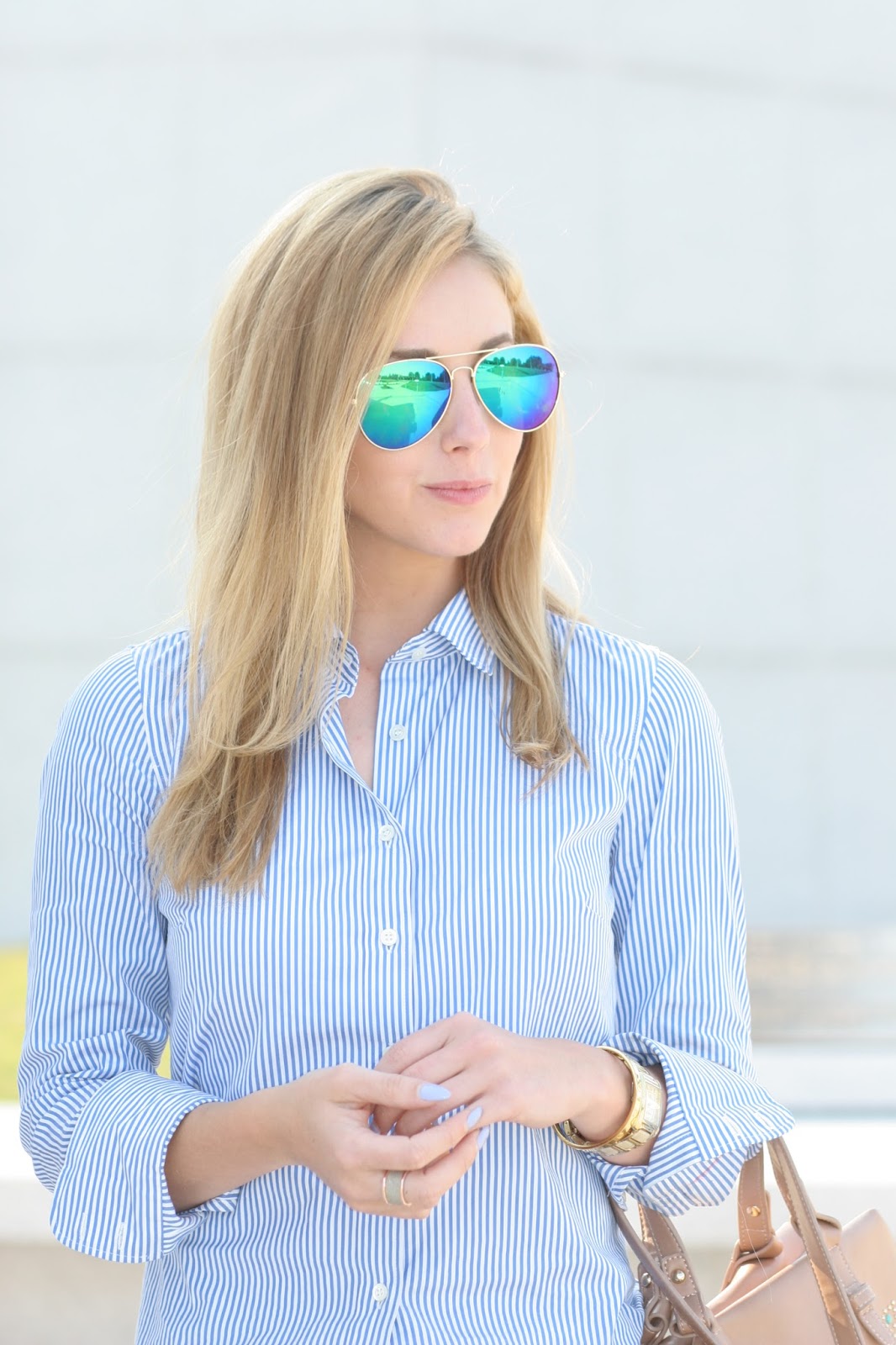I love a good fast fashion trend as much as the next gal {hello pom pom and tassel everything}, but I have to say, there really is nothing better than the classics. I mean, don’t you think the most timeless piece a person can own is a crisp, blue and white button up shirt. It truly never goes out of style! Pair it with some minimal jewelry and a gold watch and you are good to go!