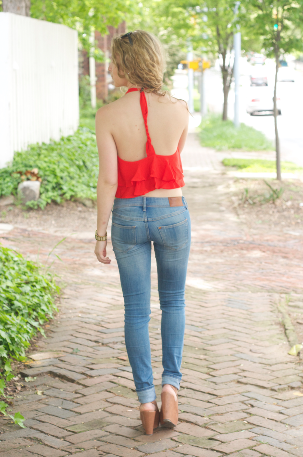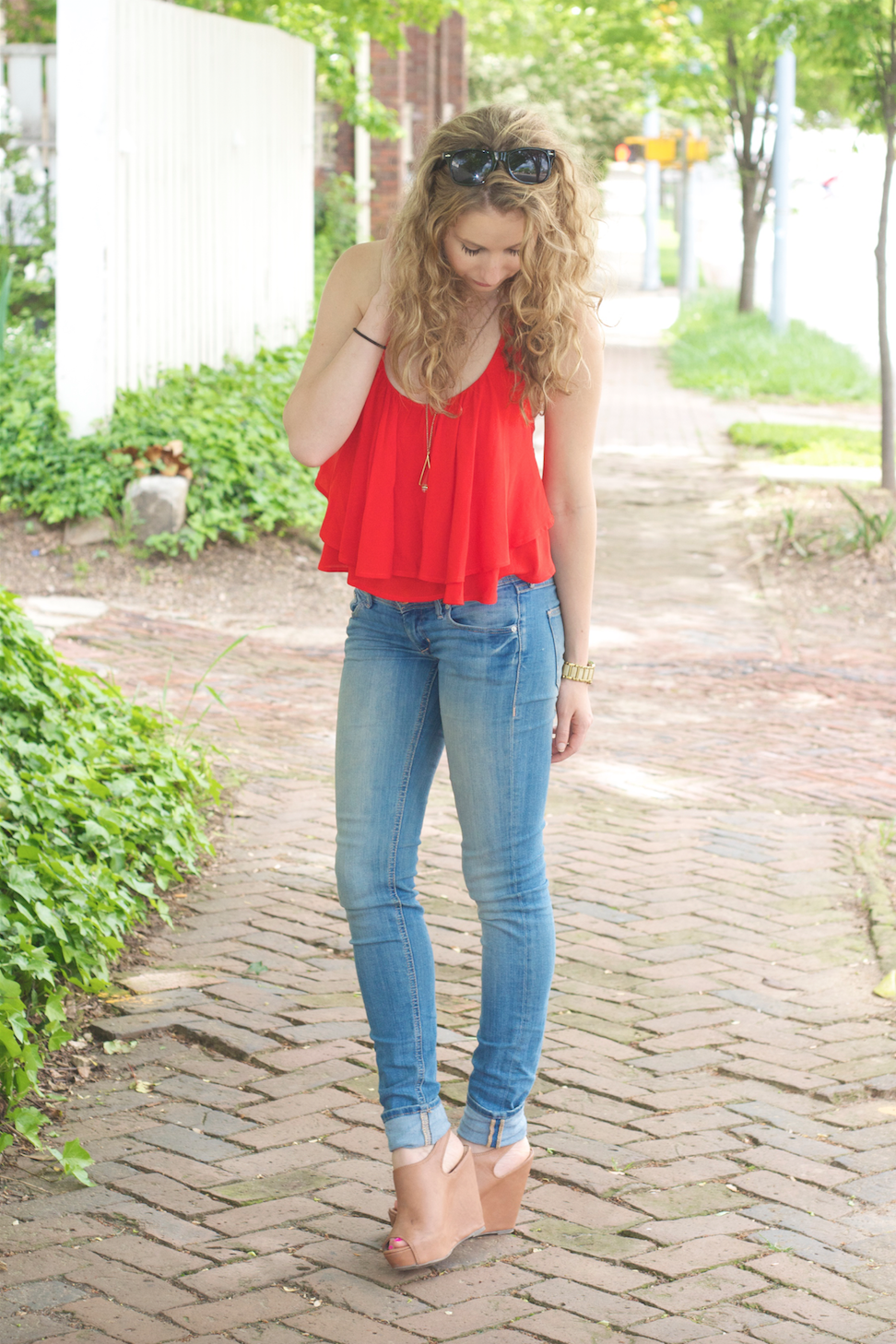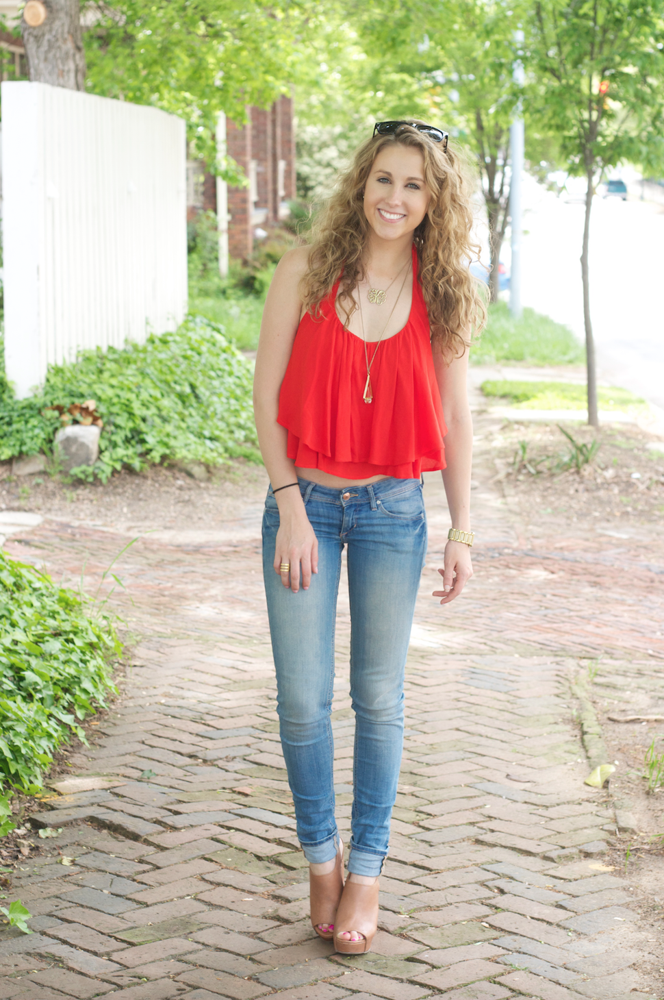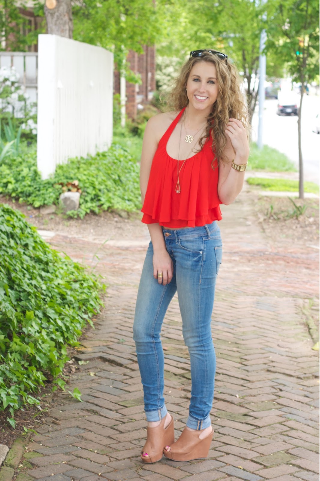 This crop top is gorgeous on you! I love the color, the way it flows, and how it is layered! Love it with the denim and those cute wedges.