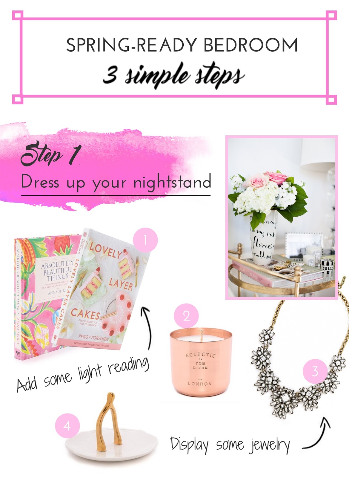- Switch up your nightstand – Add some books, a spring scented candle and casually throw some of your favorite spring jewelry on there!