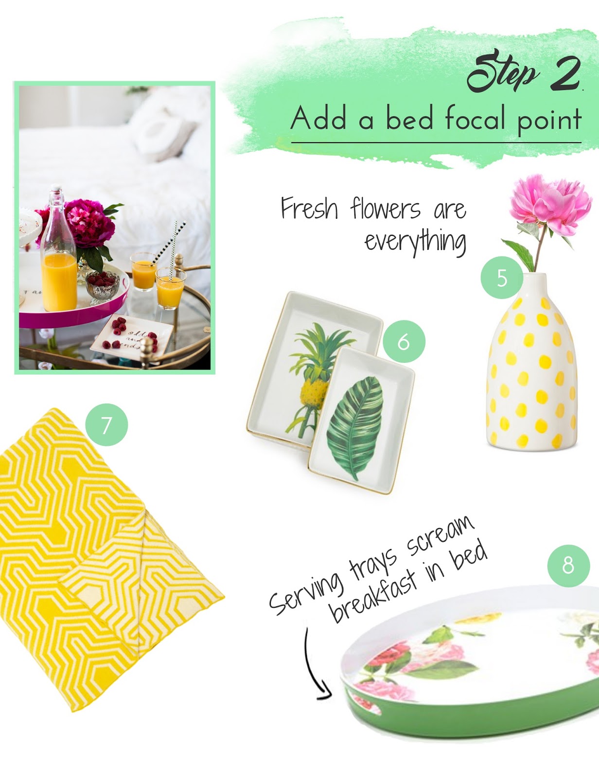 - Place a spring inspired serving tray on your bed – Layered on top of throw blanket and topped with some fresh blooms, you will be dying to have breakfast in bed.