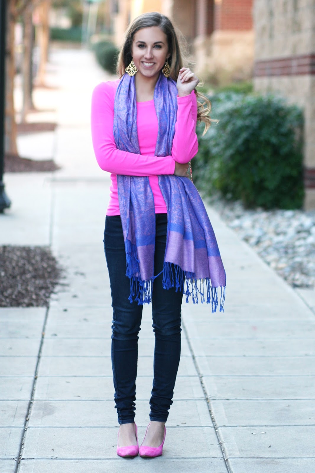 Neon pink perfect fit long sleeve tee {only $20!} Vogos peacoat in pink {similar} // Purple and blue print silk pashmina Uniqlo ultra stretch skinny jeans // Pink suede pumps Envelope clutch // Chandelier New Orleans earrings Whelp. I feel like it's pretty obvious, but pink is definitely my favorite color. I just love the pop that it makes! It instantly makes ...