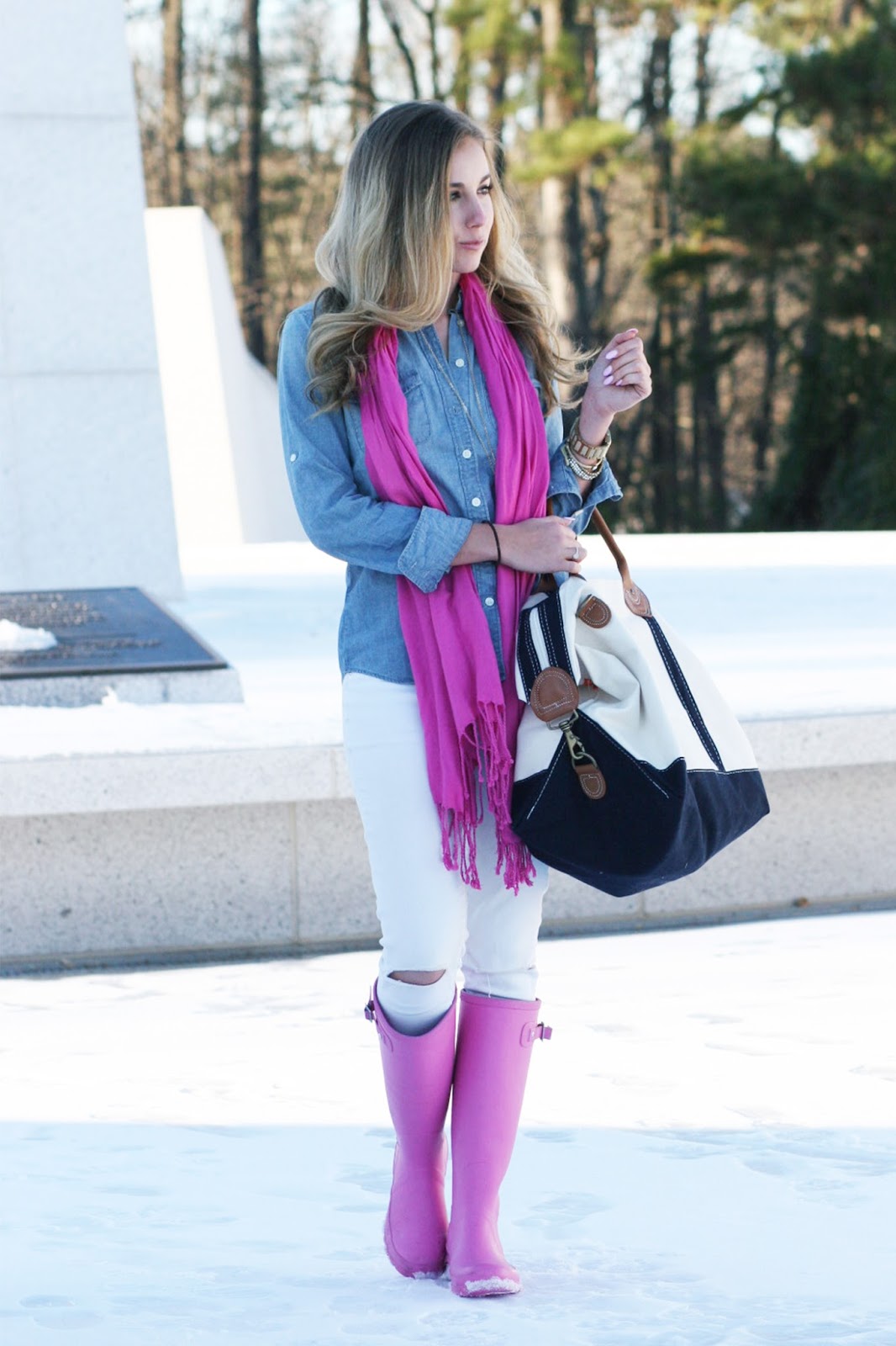Chambray button up top // White skinny jeans // Fuchsia pashmina Rectangular fit watch // Layered bracelets // Long necklace similar Shimmer ring // Monogammed weekender tote // Pink rainboots Valentine's weekend is quickly approaching and I don't know about you guys, but one of my favorite things to do as a couple is to take little getaways. There's simply nothing ...