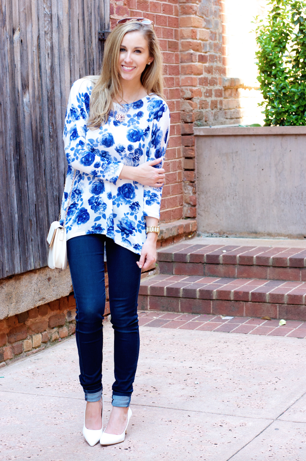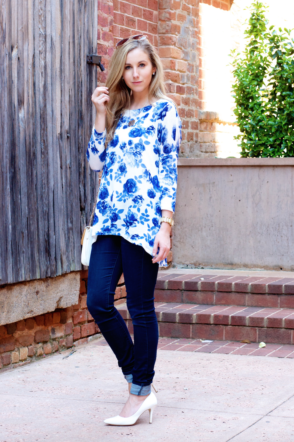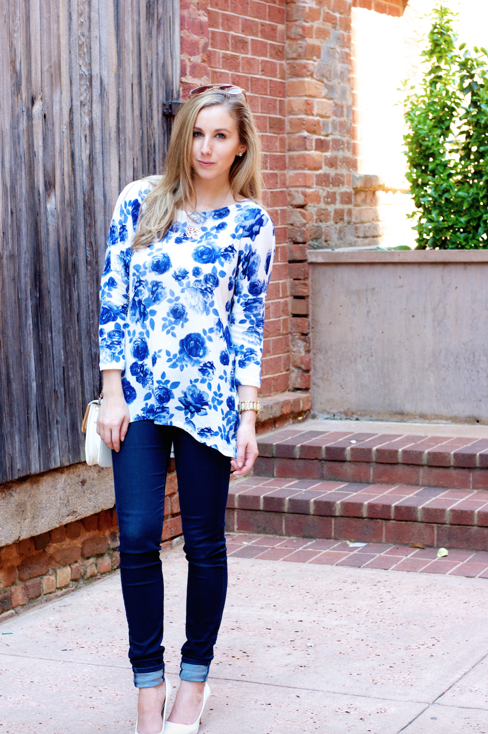 I love the blue floral pattern on you!! Such a great outfit and you can't go wrong with skinny jeans! xo, Biana –BlovedBoston