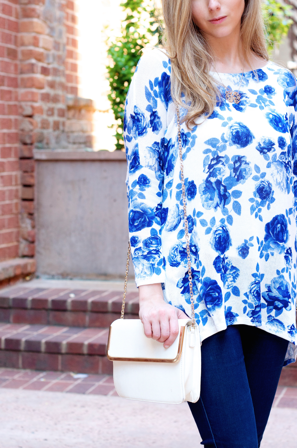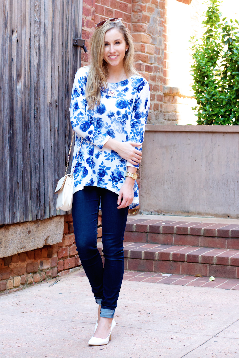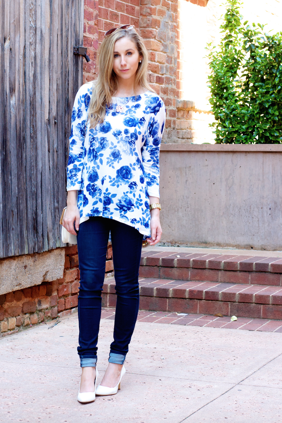 I love the blue floral pattern on you!! Such a great outfit and you can't go wrong with skinny jeans! xo, Biana –BlovedBoston
