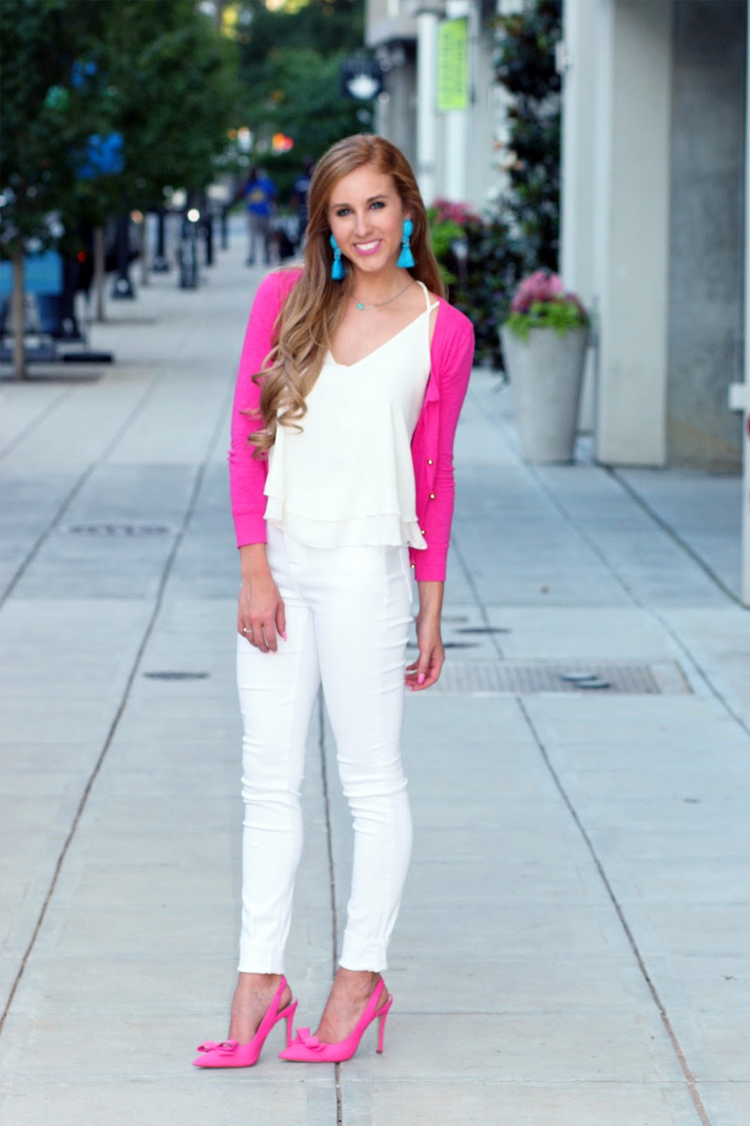 This is the cutest look! Can't go wrong with all white for summer. Love the bright pops of pink!